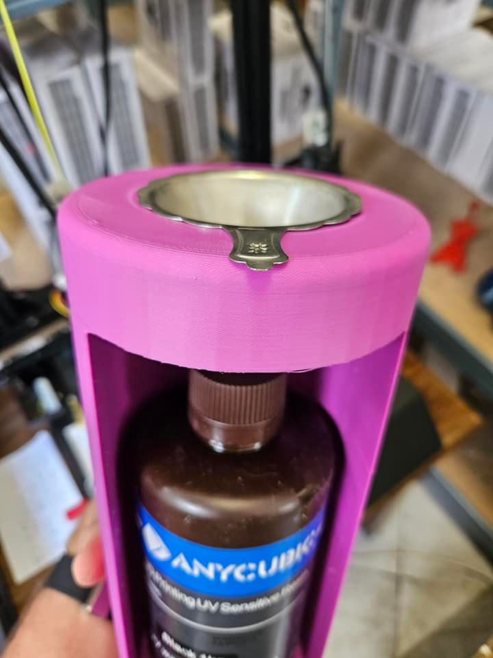 Une fois votre modèle imprimé, il se peut qu'il reste de la résine non durcie dans la cuve de votre imprimante 3D. Cette résine est réutilisable pour les prochaines impressions à condition qu'elle soit correctement filtrée et stockée afin d'éliminer les résidus solides. Pour le transfert de la résine, un récipient propre et résistant aux produits chimiques est nécessaire pour le stockage. Grâce à notre outil STL imprimable, vous pouvez créer un entonnoir sur mesure pour faciliter le transfert. Il vous suffit de l'imprimer en PLA ou en ABS, puis de l'attacher à votre conteneur pour un transfert sans dommages.
